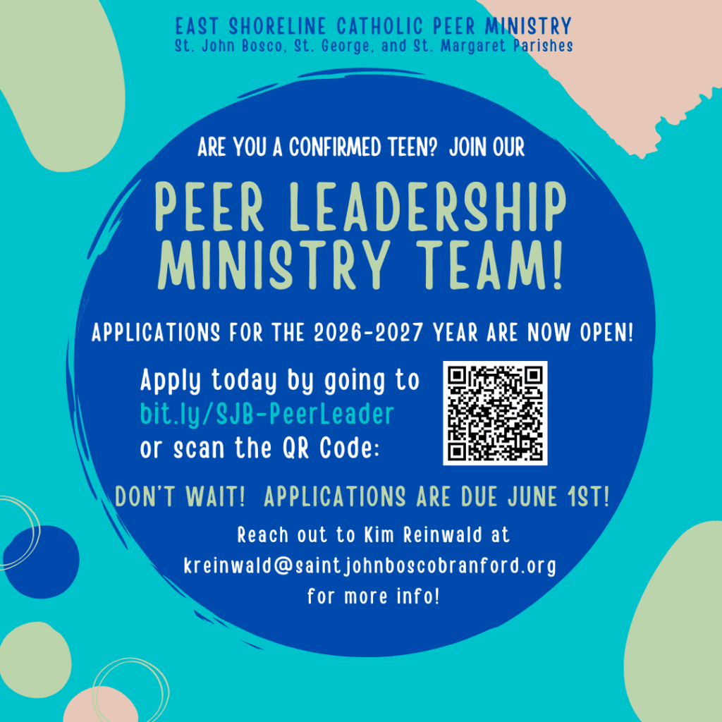 The East Shoreline Catholic Peer Ministry Team is a group of teens who serve as positive role models and witnesses to the faith among their peers and to younger children across St. John Bosco, St. George, and St. Margaret Parishes. These teens are supported as they grow in their own faith and are coached to reach out and minister to others by helping to lead retreats, faith formation classes, and other parish events.