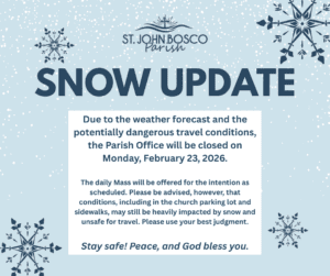 Due to the weather forecast and the potentially dangerous travel conditions, the Parish Office will be closed on Monday, February 23, 2026.